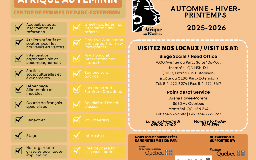 Cette nouvelle édition propose une diversité d’activités favorisant l’apprentissage, le bien-être et l’inclusion : ateliers créatifs, cours de français, conférences thématiques, sorties culturelles, accompagnement psychosocial et bien plus encore. Fidèle à sa mission, le centre demeure un lieu d’échange, de solidarité et d’épanouissement pour toutes les femmes du quartier Parc-Extension.